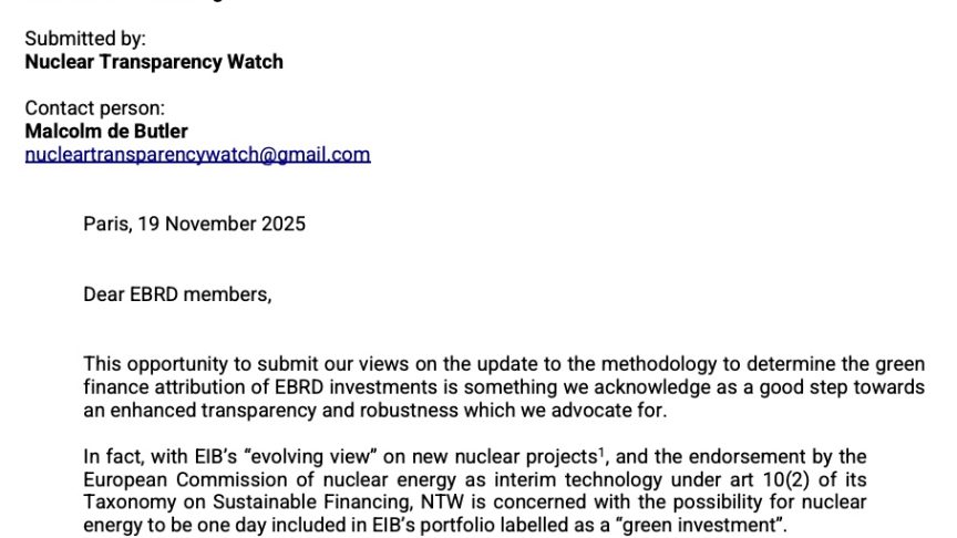 Therefore, you will find here NTW’ submission on EBRD green finance attribution underlining 4 important reasons advocating against the possibility to consider the nuclear energy as sustainable or “green”: