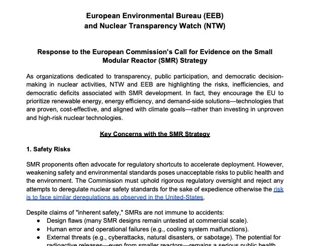 “As organizations dedicated to transparency, public participation, and democratic decision-making in nuclear activities, NTW and EEB are highlighting the risks, inefficiencies, and democratic deficits associated with SMR development. In fact, they encourage the EU to prioritize renewable energy, energy efficiency, and demand-side solutions—technologies that are proven, cost-effective, and aligned with climate goals—rather than investing in unproven and high-risk nuclear technologies.